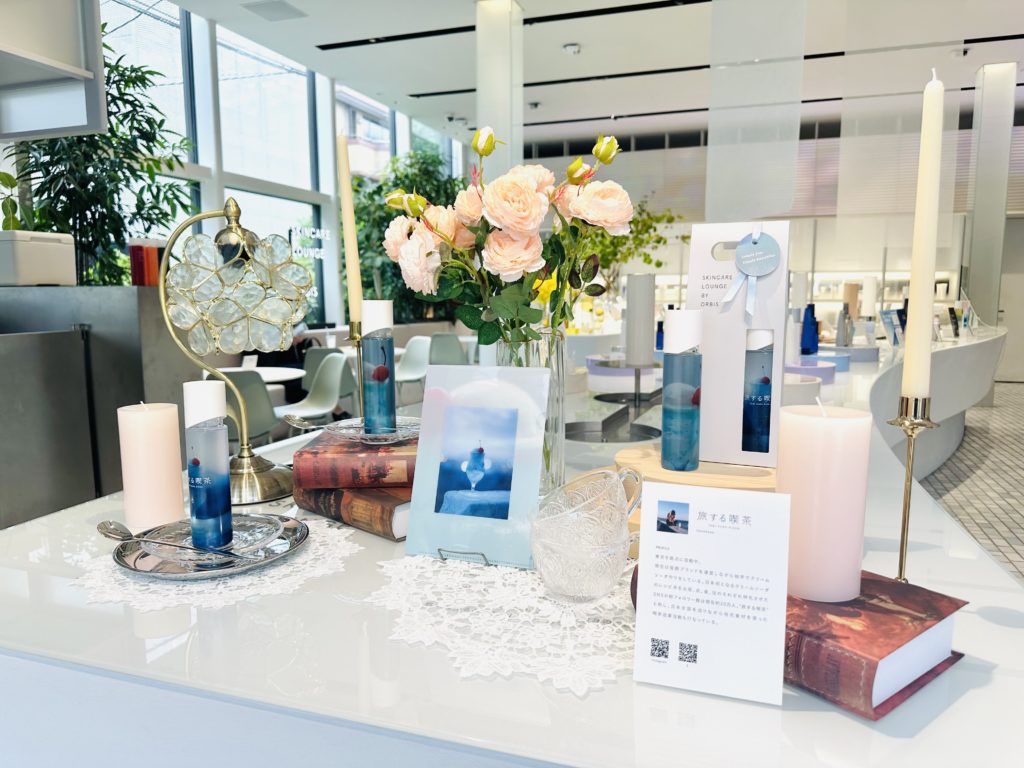 わくわくしながら店内に入ると、まず目に飛び込んできたのはコラボ化粧水のディスプレイ。