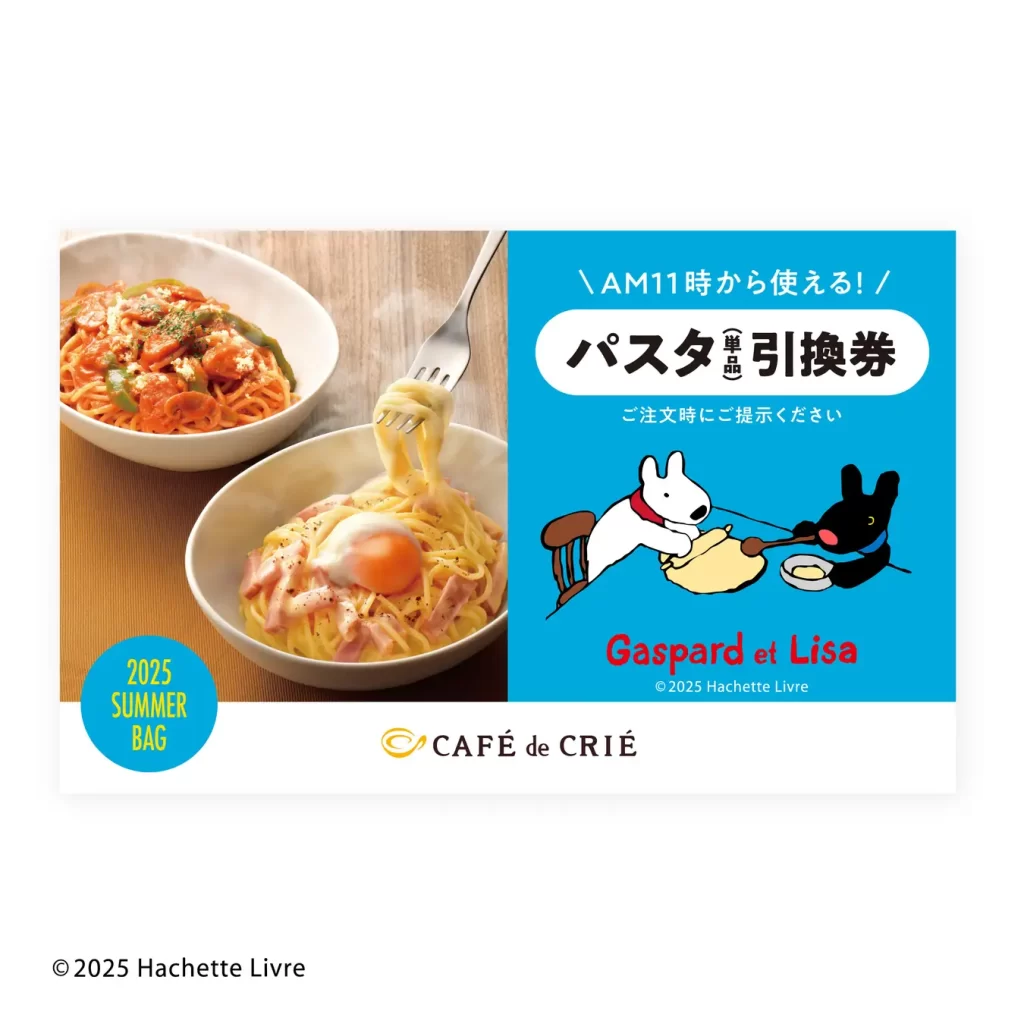 パスタ1品、ケーキ1品、ドリンク1品を引き換えられます。引換券には、リサとガスパールの日常を描いたイラスト入り。