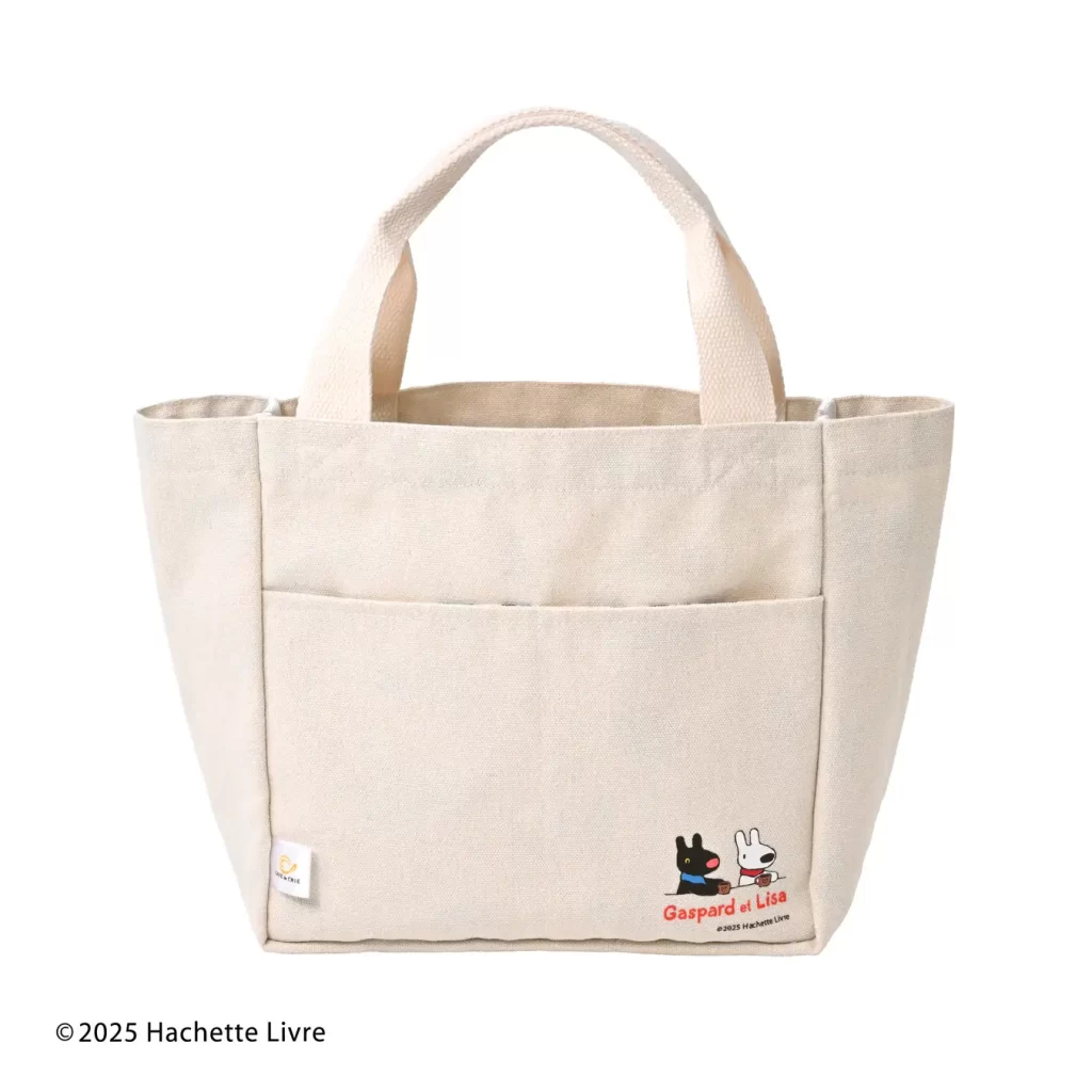 ナチュラルカラーのトートバッグには、リサとガスパールがコーヒー片手にくつろぐ姿や、ポケットから顔を出す可愛いイラストがデザインされています。