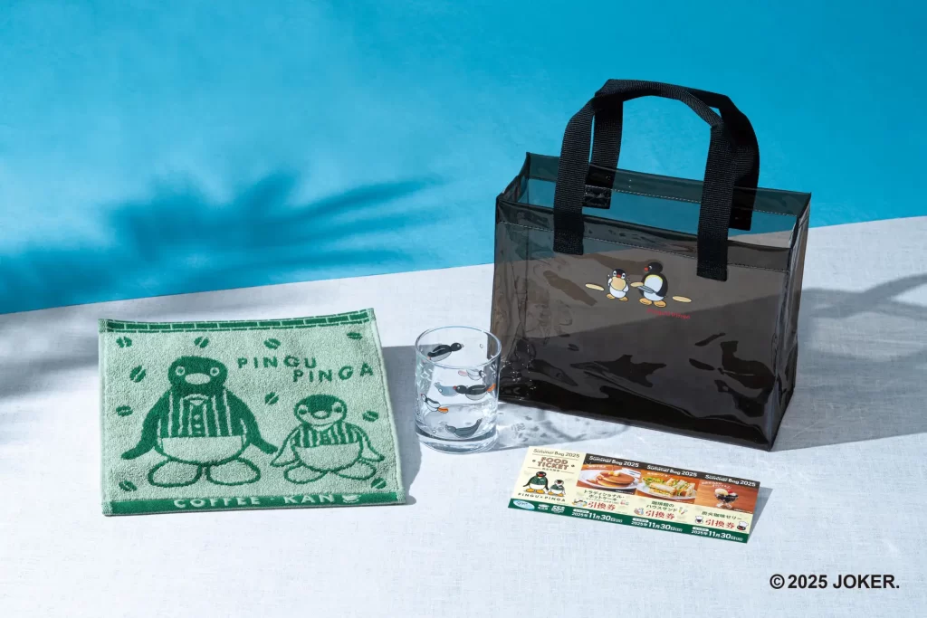 今回のサマーバッグは、ピングーらしい遊び心と『珈琲館』の落ち着いた雰囲気を融合させた、実用性と可愛らしさを兼ね備えたセット。店舗販売分とオンライン販売分で内容が異なります。